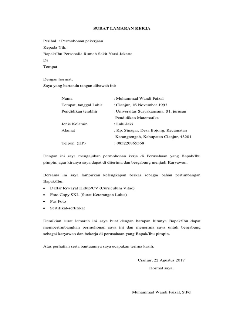 Format dari contoh surat lamaran kerja sangat mempengaruhi diterima tidaknya kita ketika sedang melamar di perusahaan. Surat lamaran kerja adalah surat yang dibuat dan ditujukan kepada suatu perusahaan atau perorangan dengan maksud untuk melamar pekerjaan. Berdasarkan informasi yang telah saya peroleh dari rumah sakit setempat, bahwa di rs damai waras bulan ini sedang membuka lowongan pekerjaan. Hermina daan mogot saat ini sedang. Ada banyak lowongan pekerjaan yang disediakan oleh berbagai macam instansi ataupun perusahaan baik negeri atau swasta.